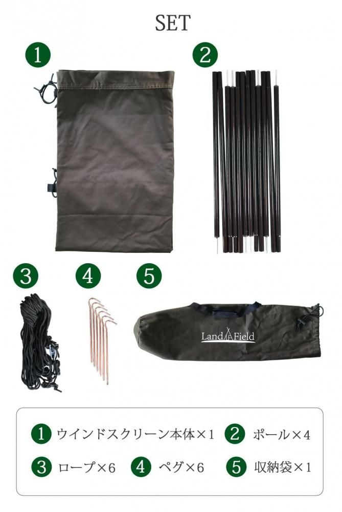 | 付属品 | ウインドスクリーン本体×1,ポール×4本、ロープ×6本、ペグ×6本、収納袋×1 |